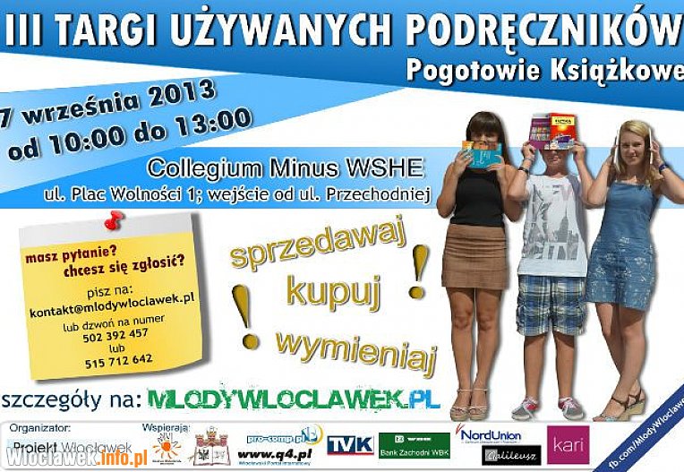 Już po raz trzeci Stowarzyszenie Obywateli Projekt Włocławek organizuje Targi Używanych Podręczników, dzięki którym uczniowie mogą tanio kupić podręczniki i sprzedać nieużywane książki. Organizatorzy przewidzieli także różne atrakcje zarówno dla kupujących jak i osób sprzedających.