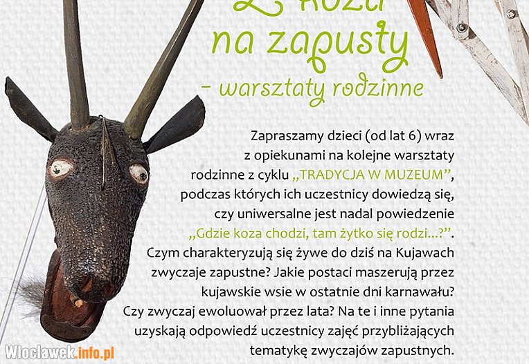 12 lutego o godzinie 11:00 w gmachu Muzeum Etnograficznego przy ulicy Bulwary im. Marszałka Józefa Piłsudskiego 6 odbędą się kolejne warsztaty rodzinne z cyklu "Tradycja z muzeum". Tym razem spotkanie zatytułowane "Z kozą na zapusty" poświęcone zostanie zwyczajom karnawałowym na Kujawach.