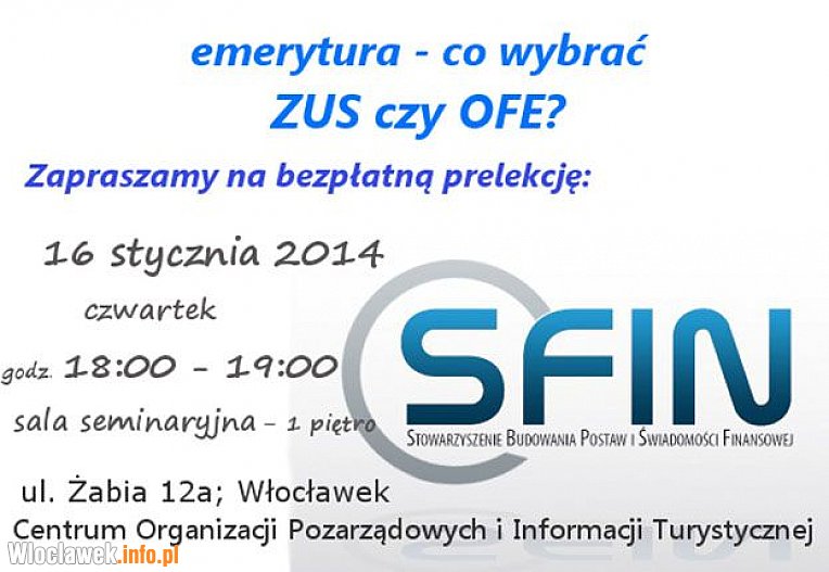 W czwartek 16go stycznia w sali seminaryjnej na ulicy Żabiej 12a, o godzinie 18.00 odbędzie się bezpłatna prelekcja o emeryturach i wyborze między ZUSem a OFE. Prelekcja będzie prowadzone przez Stowarzyszenie Budowania Postaw i Świadomości Finansowej.