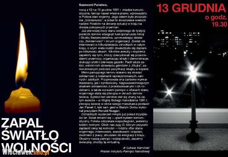 „Ogłoszony 13 grudnia 1981 roku stan wojenny pociągnął za sobą ofiary. Nie tylko ci, którzy stracili życie, ale także internowani i uwięzieni, ludzie, których wyrzucono z pracy, którym złamano kariery, których zmuszono do emigracji- wszyscy oni są ofiarami grudniowej nocy (…) Chciałbym zachęcić Państwa, by w imię pamięci o tych osobach i ich ideałach wzięli Państwo udział w naszej akcji społecznej „Ofiarom stanu wojennego. Zapal Światło Wolności” (…) Pragniemy, aby 13 grudnia o godzinie 19.30 w Państwa urzędach i innych budynkach użyteczności publicznej zapłonęły w oknach świece. Są one nawiązaniem do gestu dwóch wybitnych mężów stanu- papieża Jana Pawła II i prezydenta Stanów Zjednoczonych Ronalda Reagana- którzy w grudniu 1981 roku w ten sposób przypominali o Polsce i Polakach”.