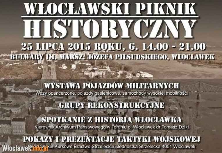 25 lipca na włocławskich bulwarach odbędzie się Włocławski Piknik Historyczny. Mieszkańcy Włocławka będą mogli zobaczyć różne pojazdy militarne, grupy rekonstrukcyjne, pokazy taktyki wojskowej, stoiska tematyczne i pogadanki historyczne.