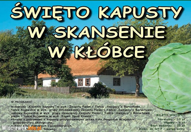 Kujawsko-Dobrzyński Park Etnograficzny zaprasza na ostatni w tym sezonie festyn folklorystyczny z cyklu "Z życia dawnej wsi" pt. "Święto kapusty w skansenie w Kłóbce". W trakcie imprezy wystąpią zespoły folklorystyczne mogące pochwalić się długoletnią działalnością, jak i młodzi wykonawcy, którzy przygodę z folklorem zaczęli niedawno.