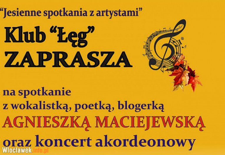 18 października, o godzinie17.00,  w klubie ?Łęg? odbędzie się impreza "Jesienne spotkania z artystami". O swoich dokonaniach opowie Agnieszka Maciejewska. Wydarzeniu towarzyszyć będzie mini recital akordeonowy.