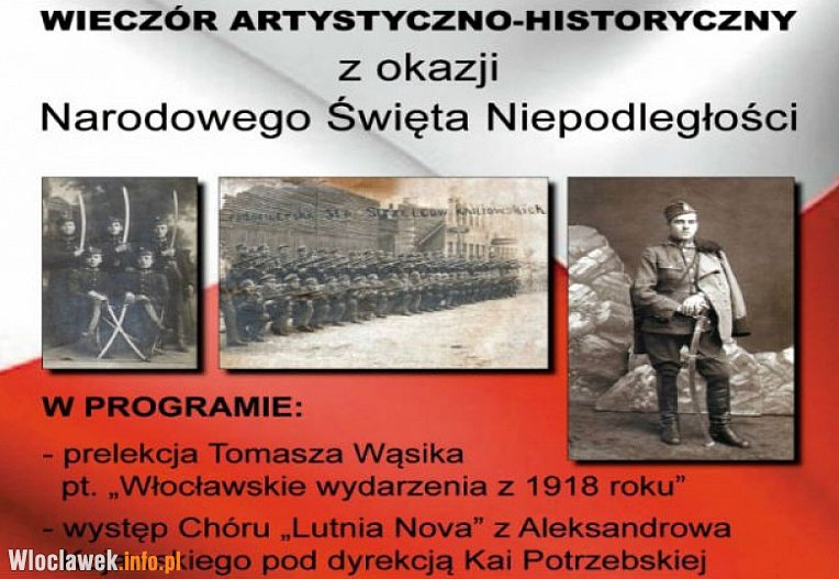 Muzeum Ziemi Kujawskiej i Dobrzyńskiej we Włocławku zaprasza wieczór artystyczno-historyczny z okazji Narodowego Święta Niepodległości. W programie prelekcja Tomasza Wąsika i występ Chóru "Lutnia Nova" z Aleksandrowa Kujawskiego pod dyrekcją Kai Potrzebskiej.