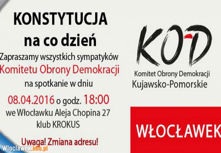 Kolejne spotkanie włocławskich działaczy Komitetu Obrony Demokracji odbędzie się w piątek (8 kwietnia), o 18:00, w klubie Krokus przy ul. Chopina 27. Oprócz dyskusji na temat Konstytucji RP przewidziano analizę obecnej sytuacji KOD, podsumowanie dotychczasowych działań i inicjatyw. Będą także przyjmowane listy od osób, które zbierały podpisy pod inicjatywą obywatelską dotyczącą Trybunału Konstytucyjnego. Chętni będą mogli podpisać się na tej liście.