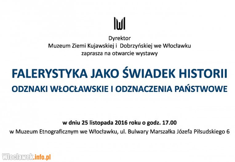 „Falerystyka jako świadek historii. Odznaki włocławskie i odznaczenia państwowe” to tytuł najnowszej wystawy przygotowanej przez Muzeum Ziemi Kujawskiej i Dobrzyńskiej we Włocławku, której wernisaż będzie miał miejsce w dniu 25 listopada br., o godzinie 17.00, na sali wystaw czasowych Muzeum Etnograficznego mieszczącego się przy Bulwarach Marszałka Józefa Piłsudskiego 6.