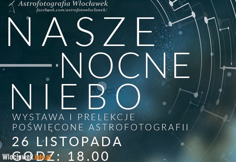 Grupa Astrofotografia Włocławek łącząca miłośników astronomii z Włocławka i okolic zaprasza na wystawę oraz prelekcję pt. Nasze Nocne Niebo. Na wystawie będziecie mogli obejrzeć zdjęcia planet naszego układu słonecznego a nawet naszą dzienna gwiazdę oraz niesamowite zdjęcia odległych galaktyk i mgławic. Zobaczycie także sprzęt, którym posługują się członkowie grupy i poznacie tajniki ich warsztatu. Spotkanie realizowane jest w ramach Projektu Sala 6. Prób. o godz. 18.00 do Sali kameralnej Centrum Kultury „Browar B.”.