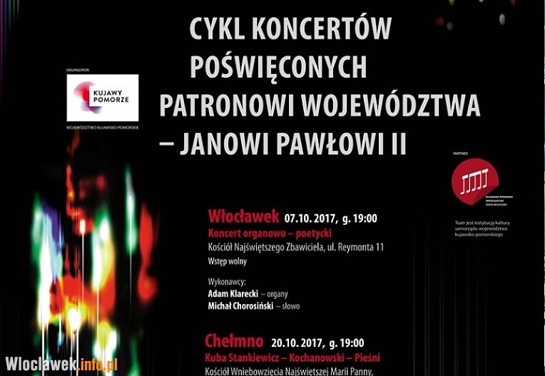 7 października o godzinie 19.00 w kościele Najświętszego Zbawiciela we Włocławku odbędzie się koncert organowo-poetycki, w trakcie którego wystąpi popularny aktor Michał Chorosiński, który przedstawi wybrane fragmenty poezji Jana Pawła II.