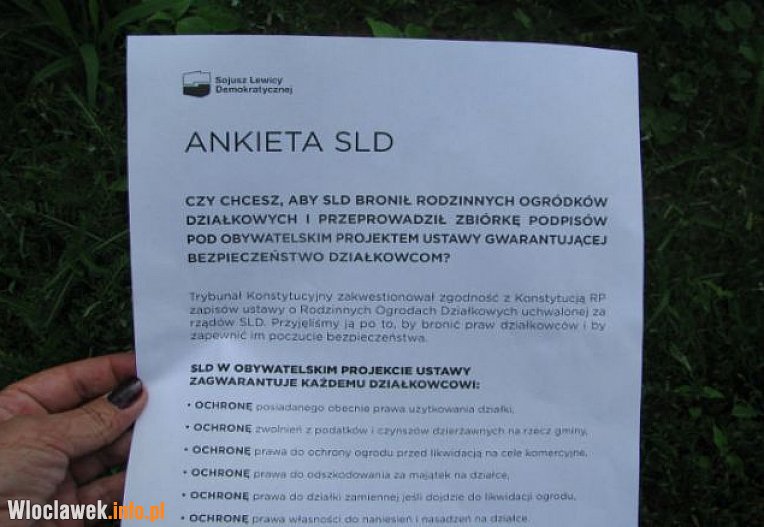 Działacze SLD proszą wszystkich zainteresowanych o wypełnienie ankiety, upoważniającej ugrupowanie polityczne do zorganizowania zbiórki podpisów pod obywatelskim projektem ustawy gwarantującej bezpieczeństwo działkowcom. Jeśli odpowiecie, że mamy was bronić przed ewentualnymi konsekwencjami orzeczenia TK, późną jesienią będziemy zbierać podpisy pod projektem ustawy obywatelskiej i wówczas zobaczymy, kto naprawdę myśli o tym, aby na działkach panował spokój, odpoczynek, relaks, leżak a nie wojny polityczne. To będzie test dla innych partii politycznych. Chcemy przekonać wszystkich, że ten skrawek ziemi uprawianej przez lata, należy się wam, działkowcom – zapewniał marszałek sejmu.