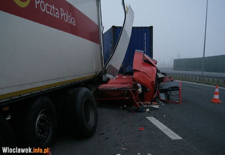 Kierujący pojazdem ciężarowym marki DAF najprawdopodobniej zasnął za kierownicą, zjechał na prawą stronę i uderzył w bariery ochronne, a następnie w stojący na prawym pasie ruchu ciężarowe iveco. Na skutek zderzenia kierowca samochodu DAF został zakleszczony w kabinie, skąd przy użyciu narzędzi hydraulicznych wydobyli go strażacy. 23-latek został odwieziony do szpitala.
