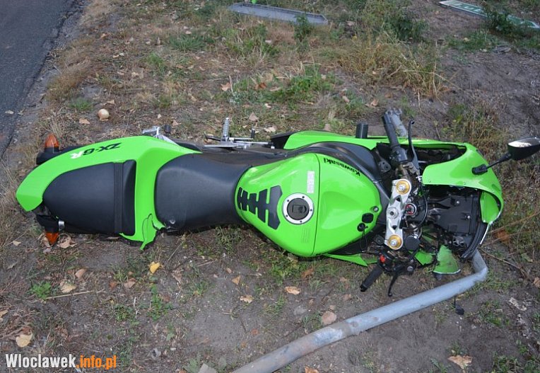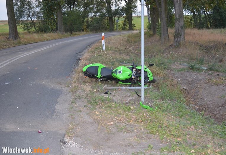 Kierujący jednośladem marki Kawasaki nie dostosował prędkości jazdy do warunków na drodze i nie zapanował nad pojazdem i uderzył w znak drogowy. Z urazem nogi trafił do szpitala.