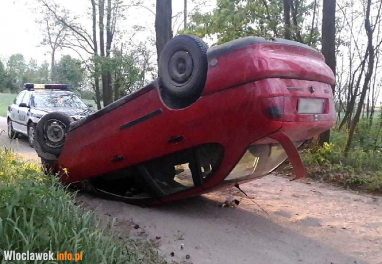 Policjanci ruchu drogowego zostali skierowani na miejsce kolizji w Lubówcu. Zastali tam leżącego na dachu seata. Kierowca auta nie ucierpiał i na szczęście w chwili zdarzenia był sam na drodze. Poniesie konsekwencje gdyż był pijany i nie posiadał uprawnień.