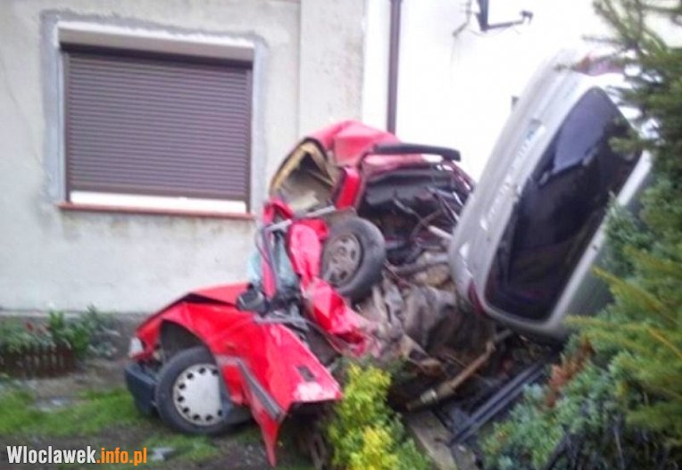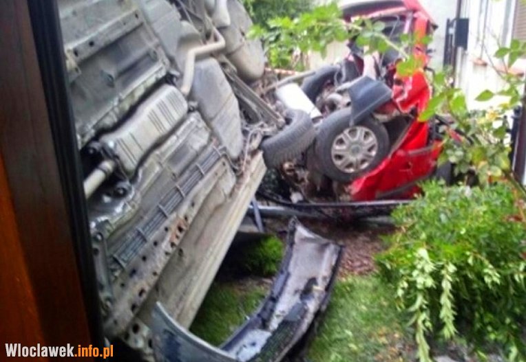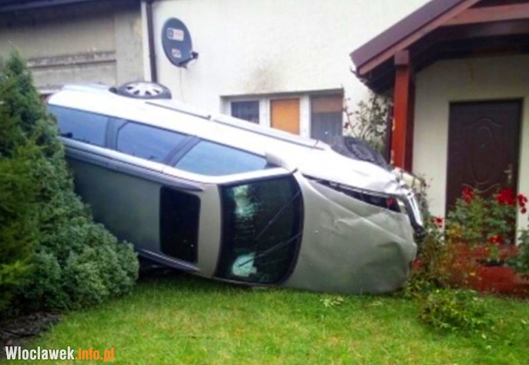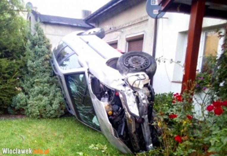 W zaparkowaną przed domem hondę civic uderzył samochód osobowy opel vectra, który w wyniku uderzenia przewrócił się na prawy bok. Uszkodził zaparkowane przed domem auto, elewację budynku oraz zadaszone wejście.