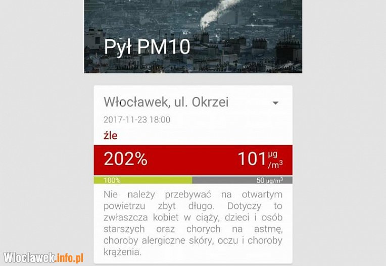 Wczoraj 23 listopada o godzinie 18:00 dane ze stacji pomiarowej zlokalizowanej przy ul. Okrzei wskazywały na to, że jakość powietrza w naszym mieście jest zła.