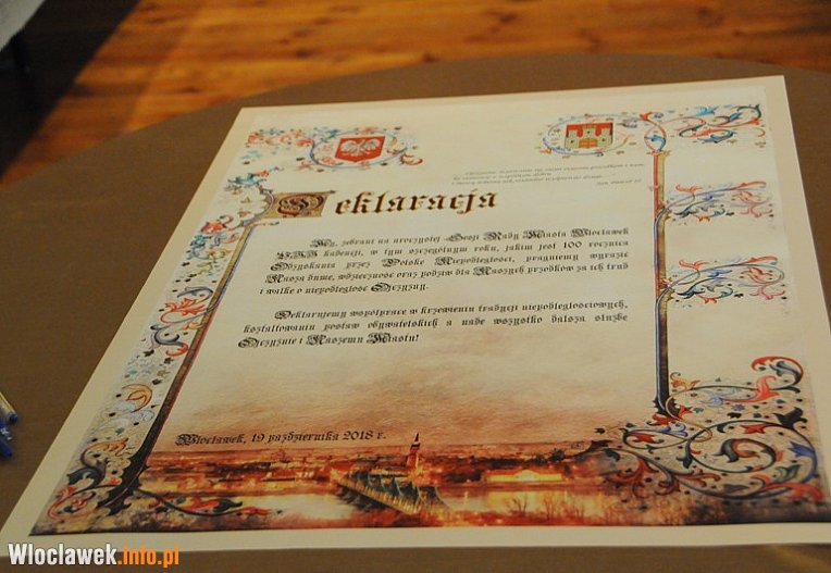 My, zebrani na uroczystej Sesji Rady Miasta Włocławek VII kadencji, w tym szczególnym roku, jakim jest 100. rocznica Odzyskania przez Polskę Niepodległości, pragniemy wyrazić Naszą dumę, wdzięczność oraz podziw dla Naszych przodków za ich trud i walkę o niepodległość Ojczyzny. Deklarujemy współpracę w krzewieniu tradycji niepodległościowych, kształtowaniu postaw obywatelskich a nade wszystko dalszą służbę Ojczyźnie i Naszemu Państwu!