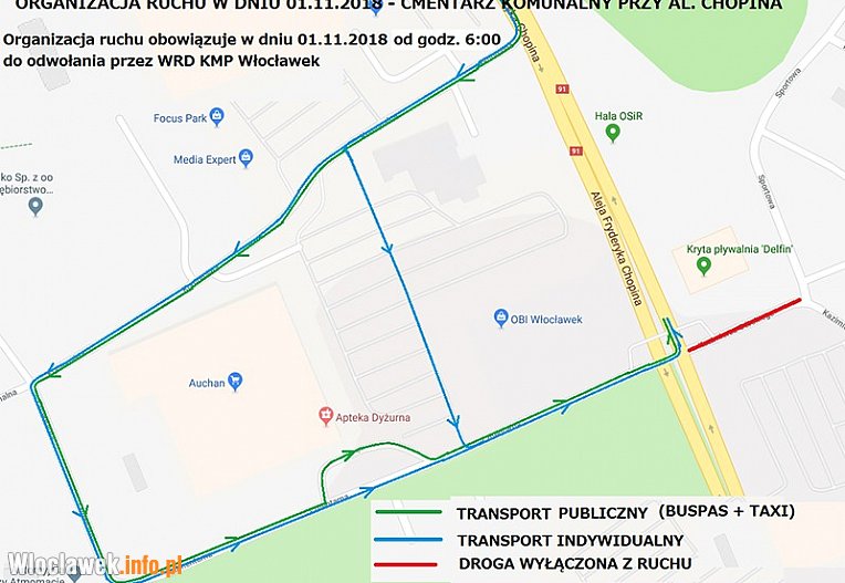 Miejski Zarząd Usług Komunalnych i Dróg informuje, że z okazji obchodów Wszystkich Świętych, zaplanowano zmianę w organizacji ruchu w rejonie Cmentarza Komunalnego we Włocławku. Czasowa zmiana będzie obowiązywać 1 listopada od godziny 6:00