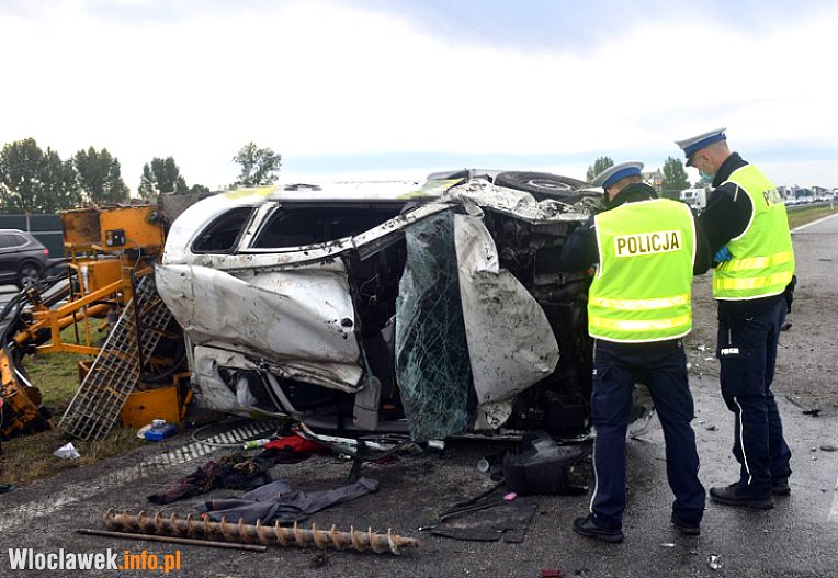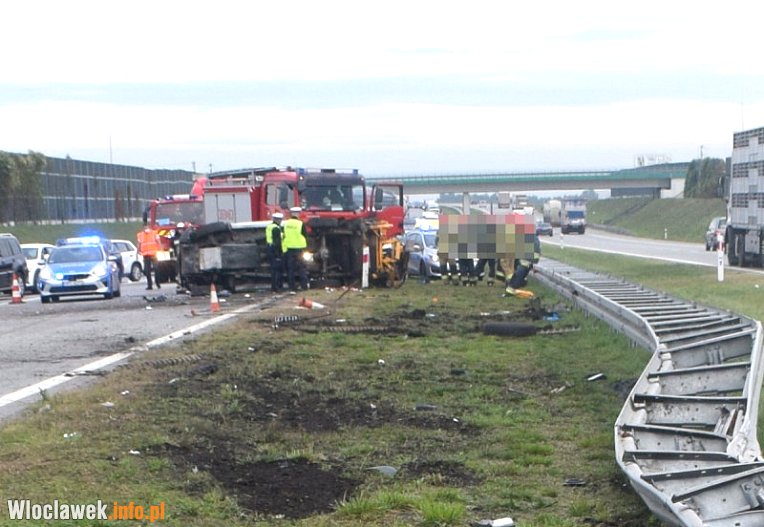 Policjanci wstępnie ustalili, że w pojeździe mitsubishi jadącym w kierunku Torunia wystrzeliła opona. Skutkiem tego była utrata panowania nad pojazdem przez 53-letniego kierowcę i zjechanie na pas zieleni oddzielający dwie jezdnie. Tam auto dodatkowo uderzyło w bariery ochronne, co spowodowało przekoziołkowanie pojazdu na jezdnię w kierunku Łodzi i zablokowanie obu jej pasów. W wyniku zdarzenia kierujący i pasażer z mitsubishi trafili do szpitala z obrażeniami.