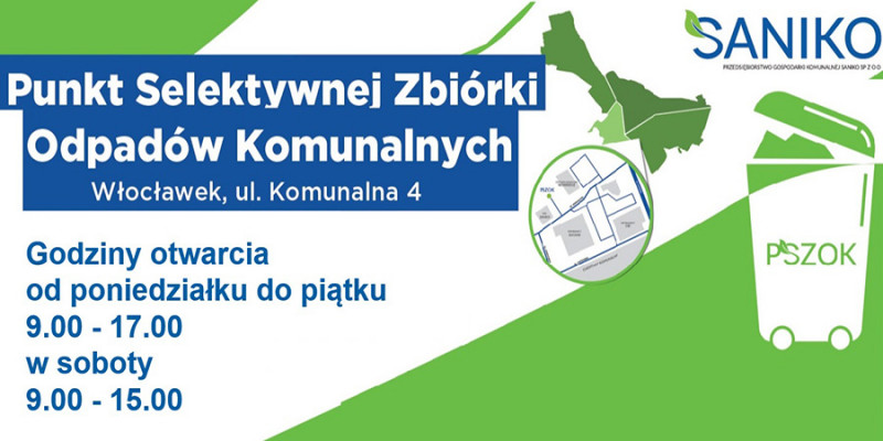 Przedsiębiorstwo Gospodarki Komunalnej "Saniko" informuje, że od 8 stycznia 2022 roku, w każdą sobotę Punkt Selektywnej Zbiórki Odpadów Komunalnych przy ul. Komunalnej 4 we Włocławku, czynny będzie od godziny 9.00 do 15.00.