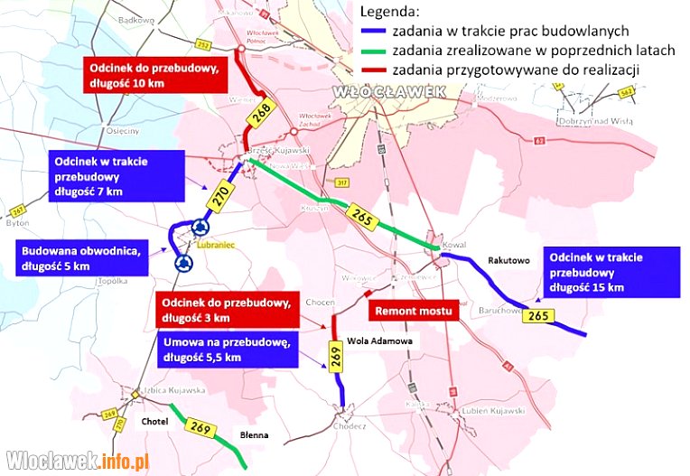 Przebudowa drogi wojewódzkiej nr 269 Choceń-Wola Adamowa to tylko jedna z kilku dużych inwestycji drogowych realizowanych na terenie powiatu włocławskiego. Zaawansowane prace prowadzone są również przy: przebudowie drogi wojewódzkiej nr 265 Kowal-granica województwa, budowie obwodnicy Lubrańca i modernizacji drogi wojewódzkiej nr 270 Brześć-Lubraniec.